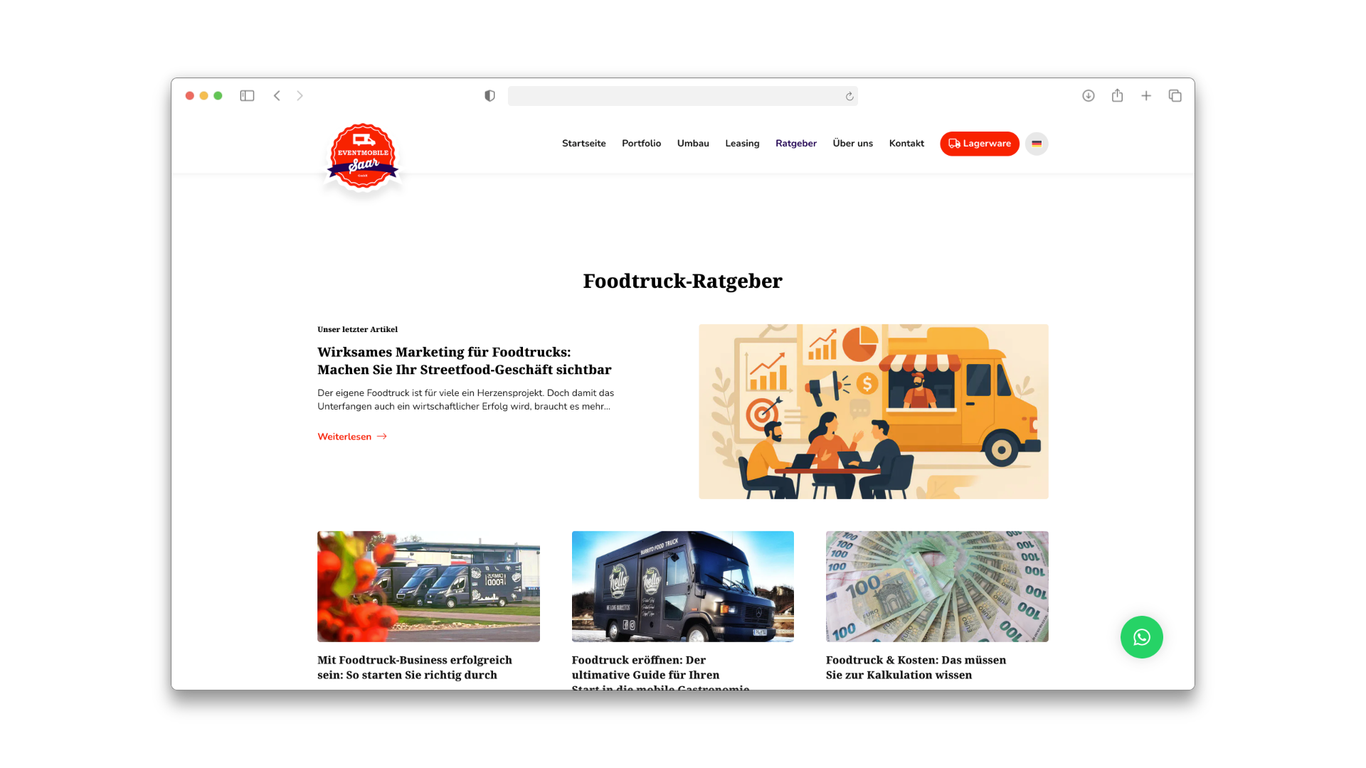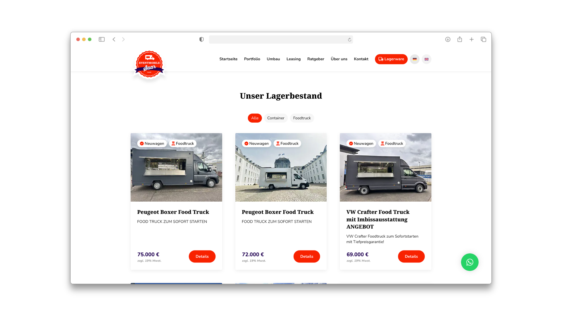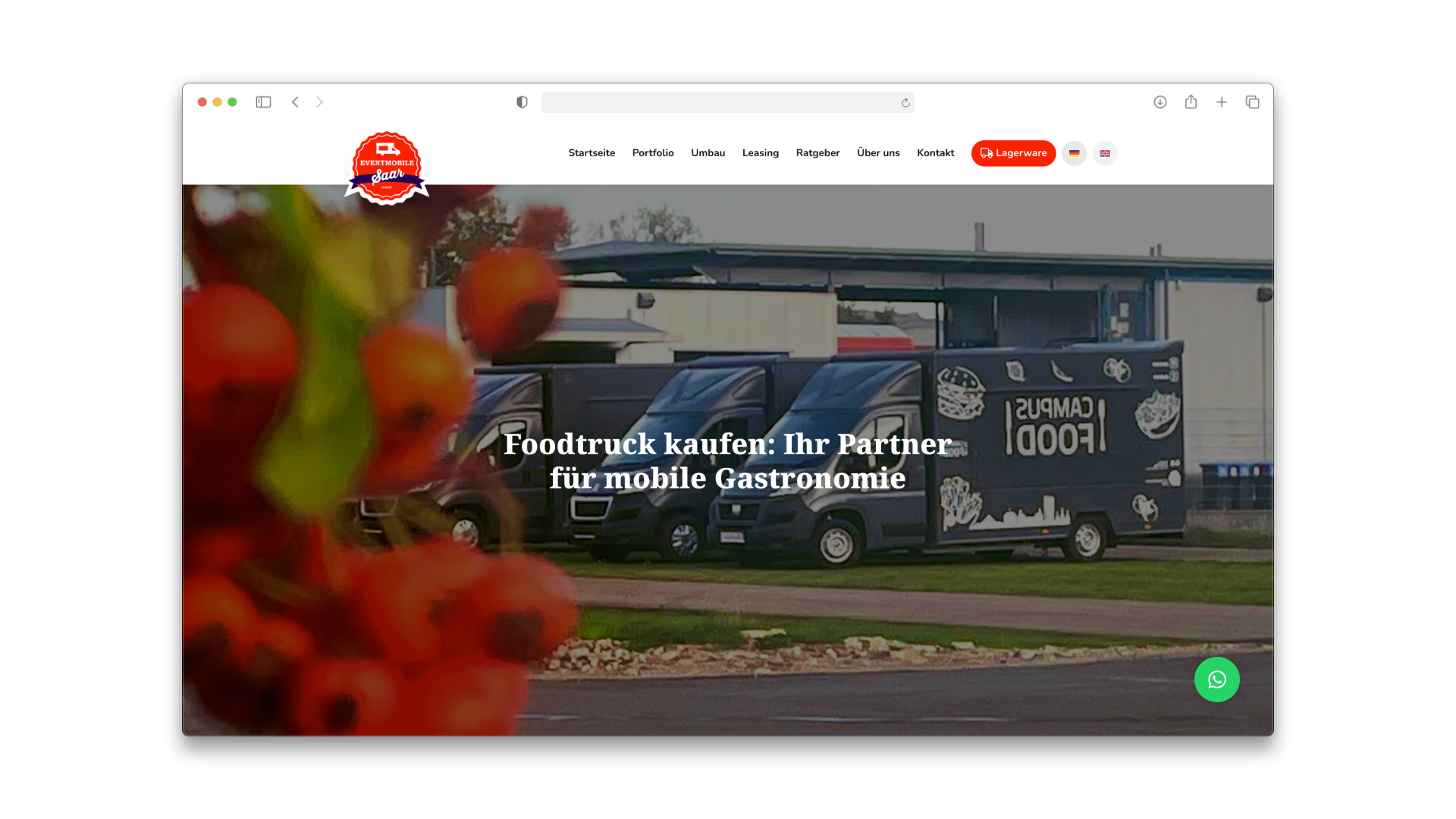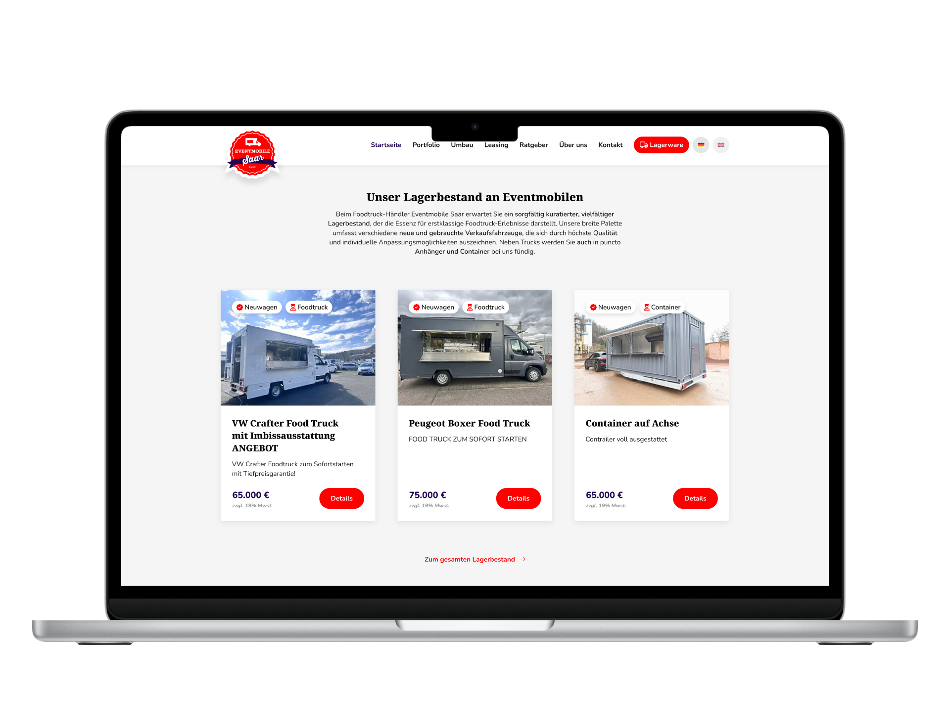 Die Website für Eventmobile Saar wurde mit dem Anspruch gestaltet, die enorme Vielfalt und Individualität der mobilen Verkaufsfahrzeuge eindrucksvoll zu präsentieren. Im Zentrum stand ein lebendiges Design mit starken Bildern und konkreten Beispielen, die das Leistungsspektrum des Unternehmens greifbar machen.